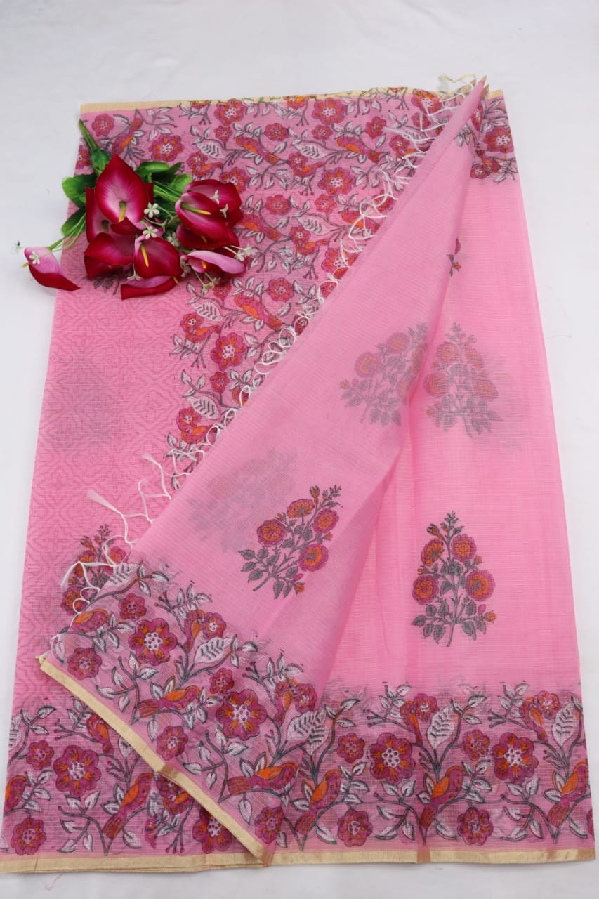 Baby Pink Artistic Flowery KotaDoria Block Printed Cotton Saree With Blouse