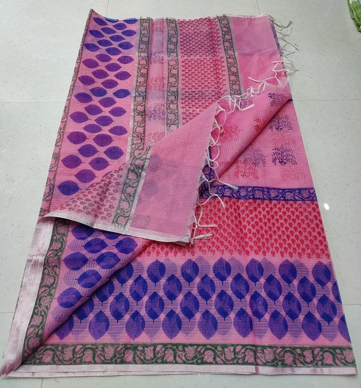Baby Pink Base Navy Blue Leafy Ethnic KotaDoria Block Printed Cotton Saree With Blouse