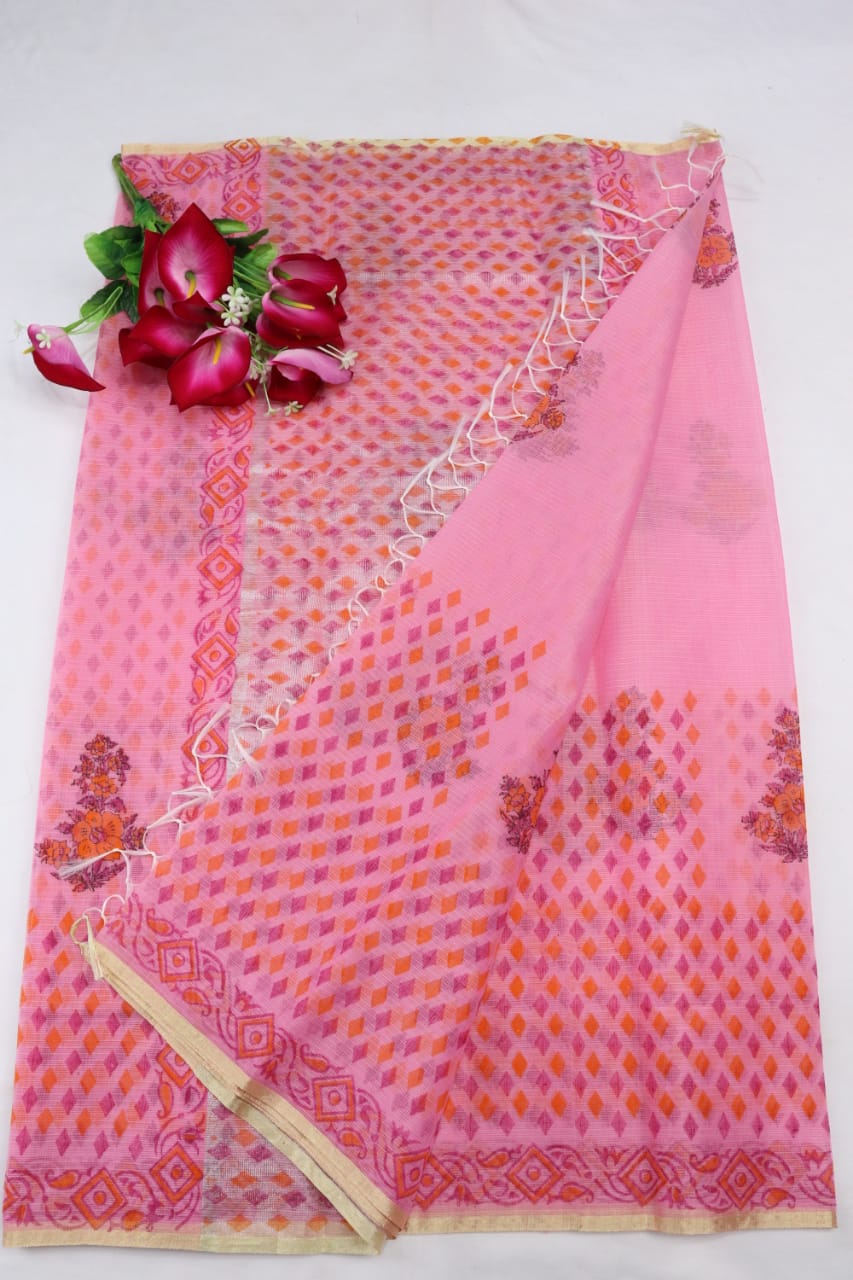 Ballet Slipper Pink Colored Artistic Flowery KotaDoria Block Printed Cotton Saree With Blouse