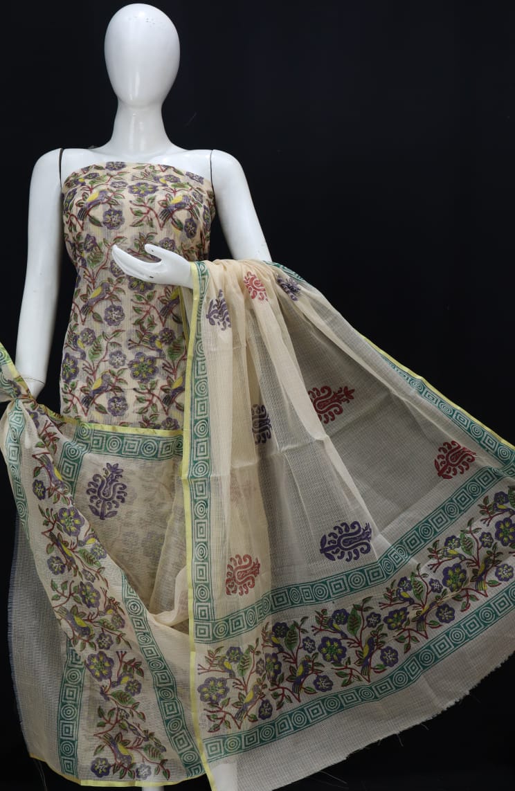 Barley White Flowery Designer Handblock Printed Cotton Kota Doria Un-Stitched Suit With Dupatta