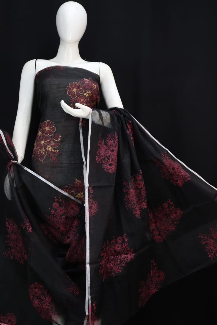 Floral Black Printed Kota Doria Cotton Fabric Dress Material