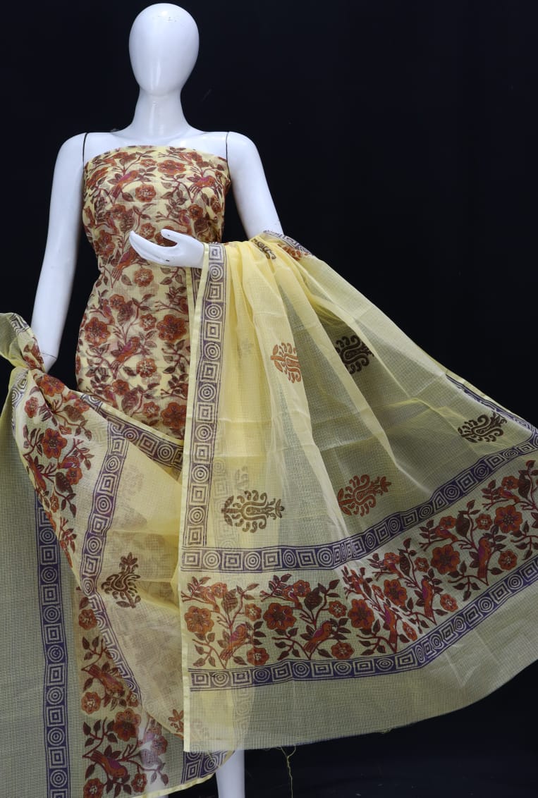 Blonde Yellow Pretty Maroon Flowery Designer Handblock Printed Cotton Kota Doria Un-Stitched Suit With Dupatta