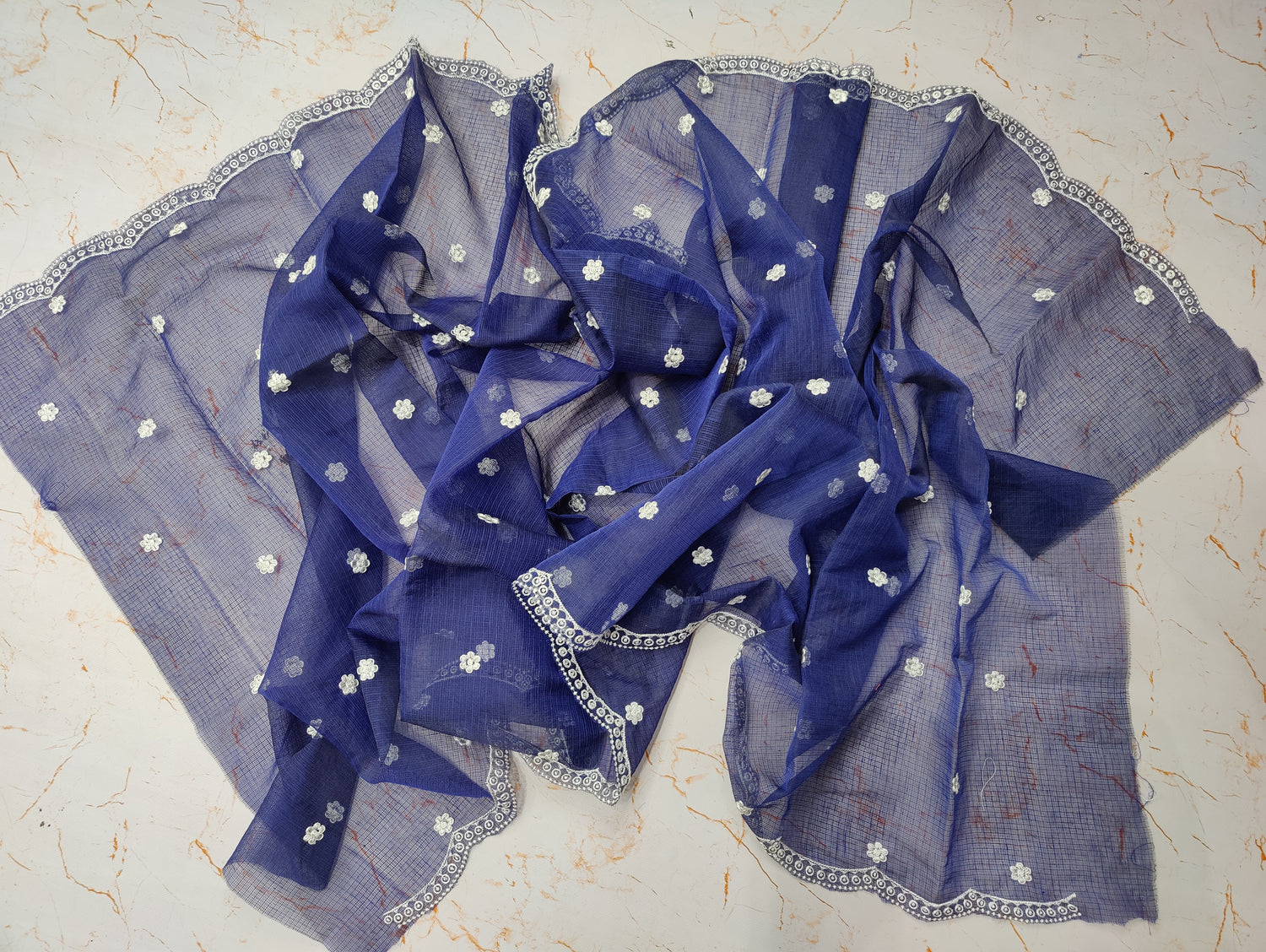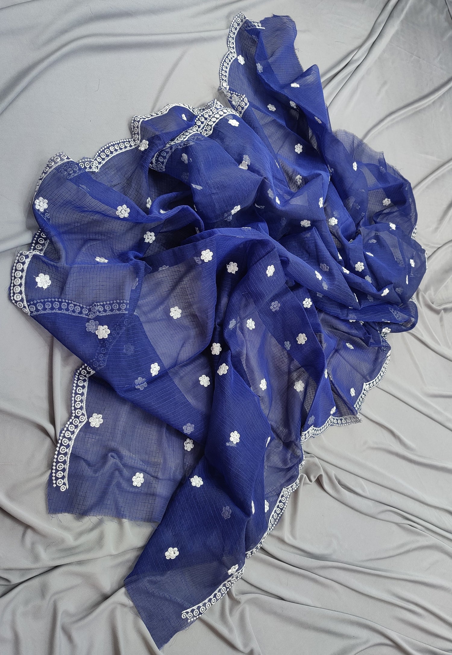 Blue Base White Thread Kota Doria Embroidery Dupatta