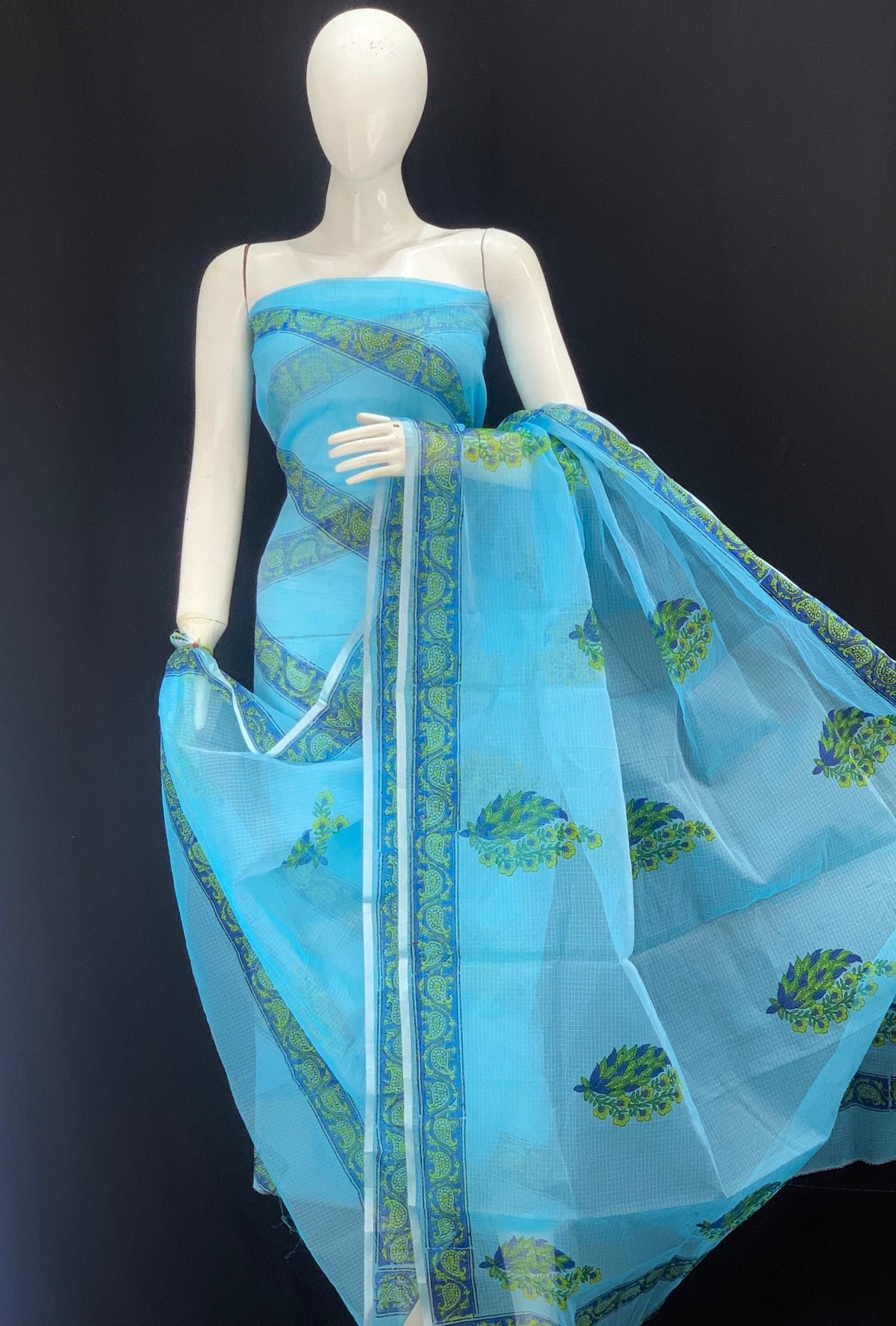 Blue Stripes Royal Rajasthani Designer Handblock Printed Cotton Kota Doria un-stitched Suit With Dupatta