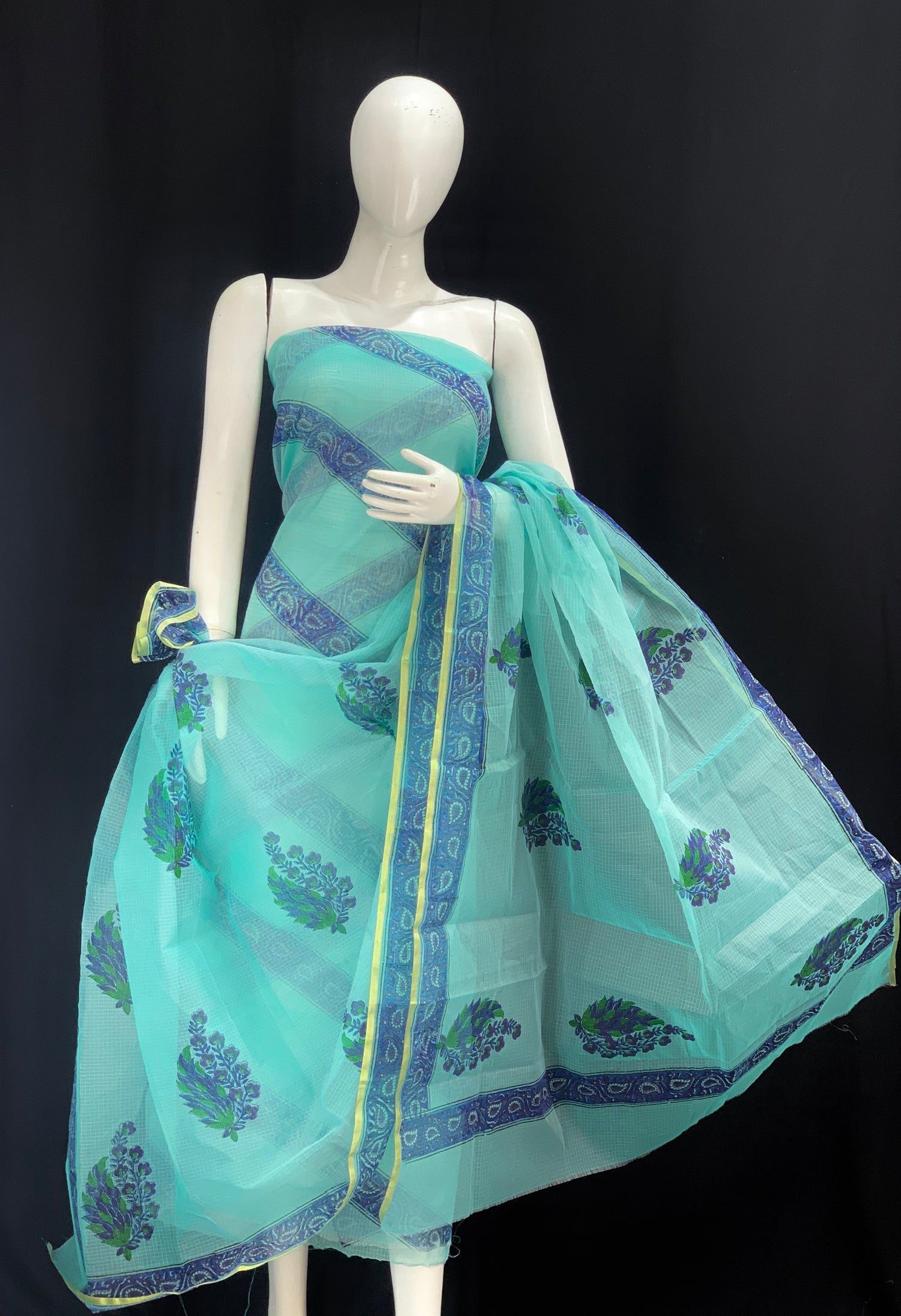 Blue striped Designer Handblock Printed Cotton Kota Doria un-stitched Suit With Dupatta