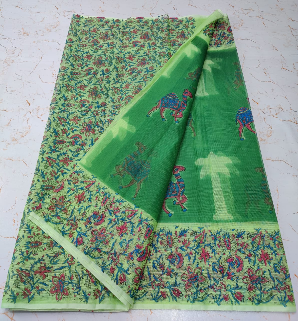 Cadmium Green Refined KotaDoria Dye Block Printed Cotton Saree With Blouse