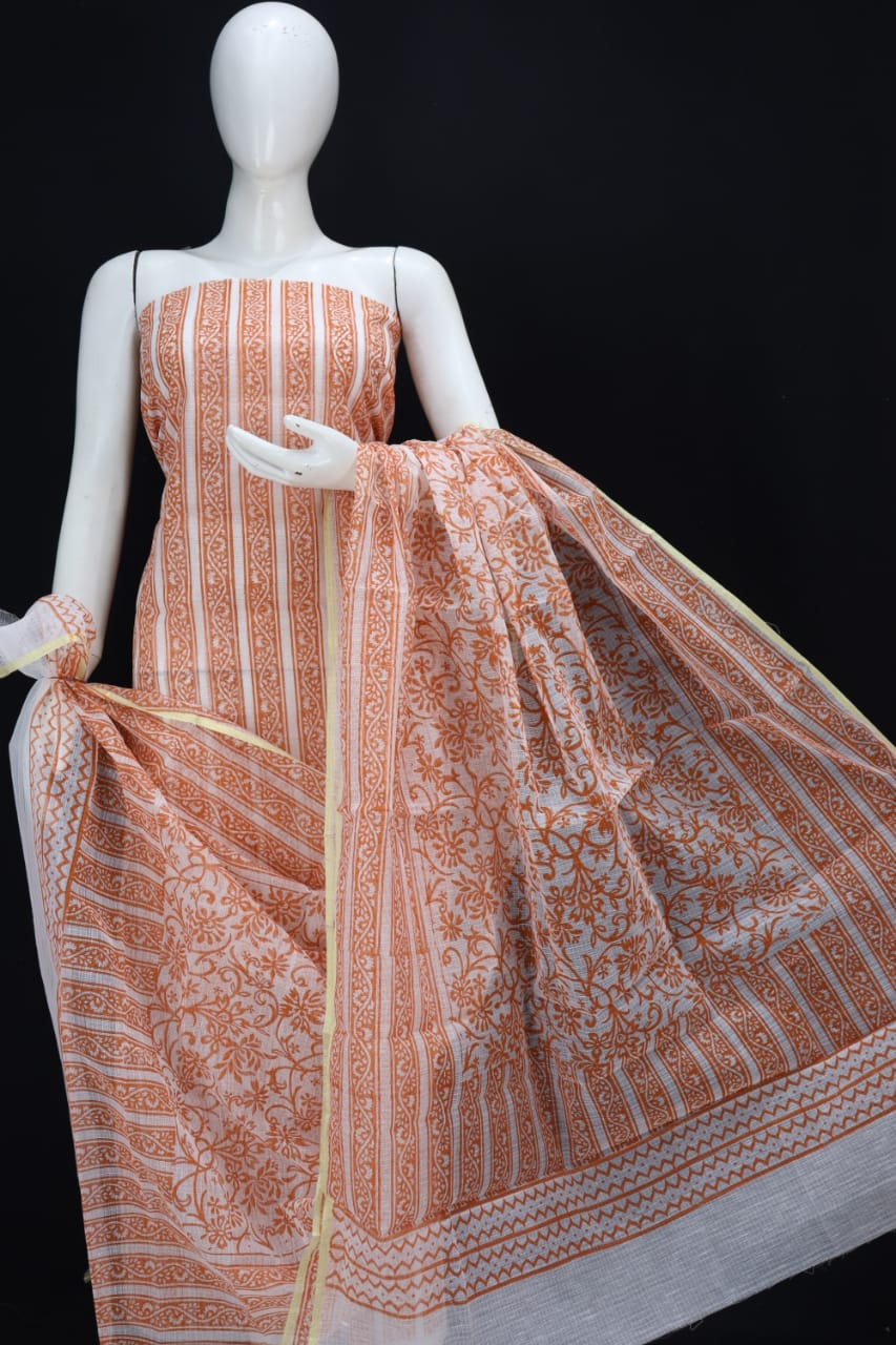 Cantaloupe Orange Flowery Designer Handblock Printed Cotton Kota Doria Un-Stitched Suit With Dupatta