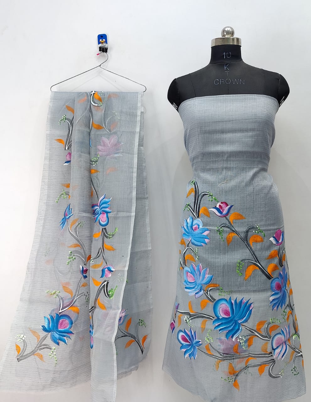Classy Grey Blue Flowery Brush Paint Kotadoria Un-Stitched Suit With Dupatta