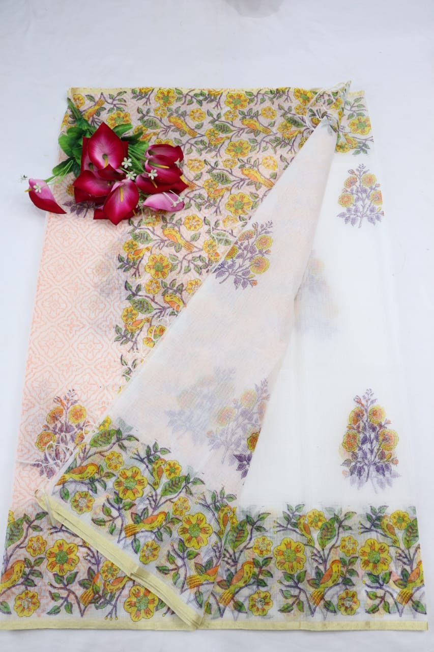 Delicate White Flowery KotaDoria Block Printed Cotton Saree With Blouse