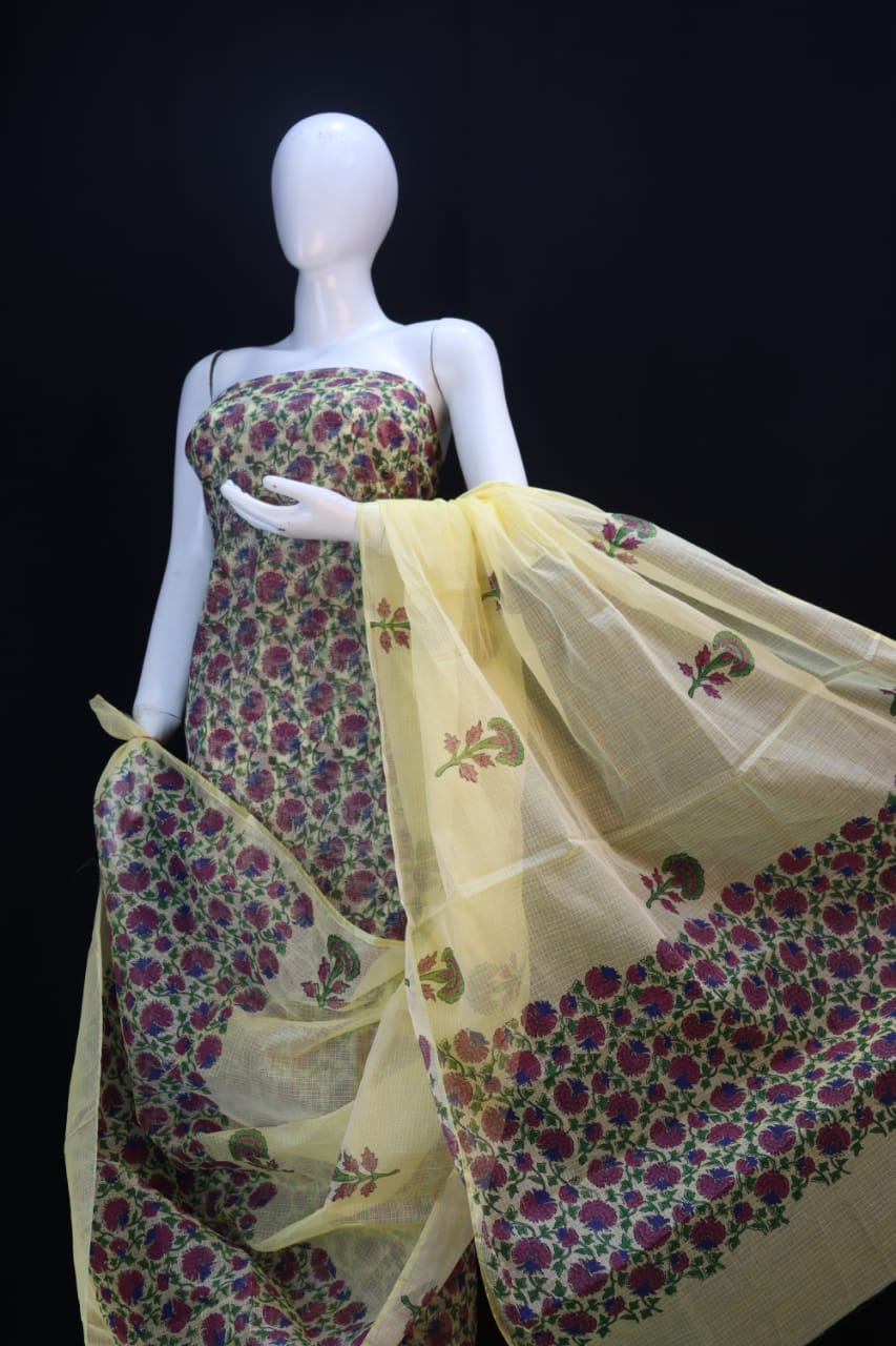 DESIGNER Brownish Yellow FLOWER HAND BLOCK PRINT KOTA DORIA SUIT Dress Material