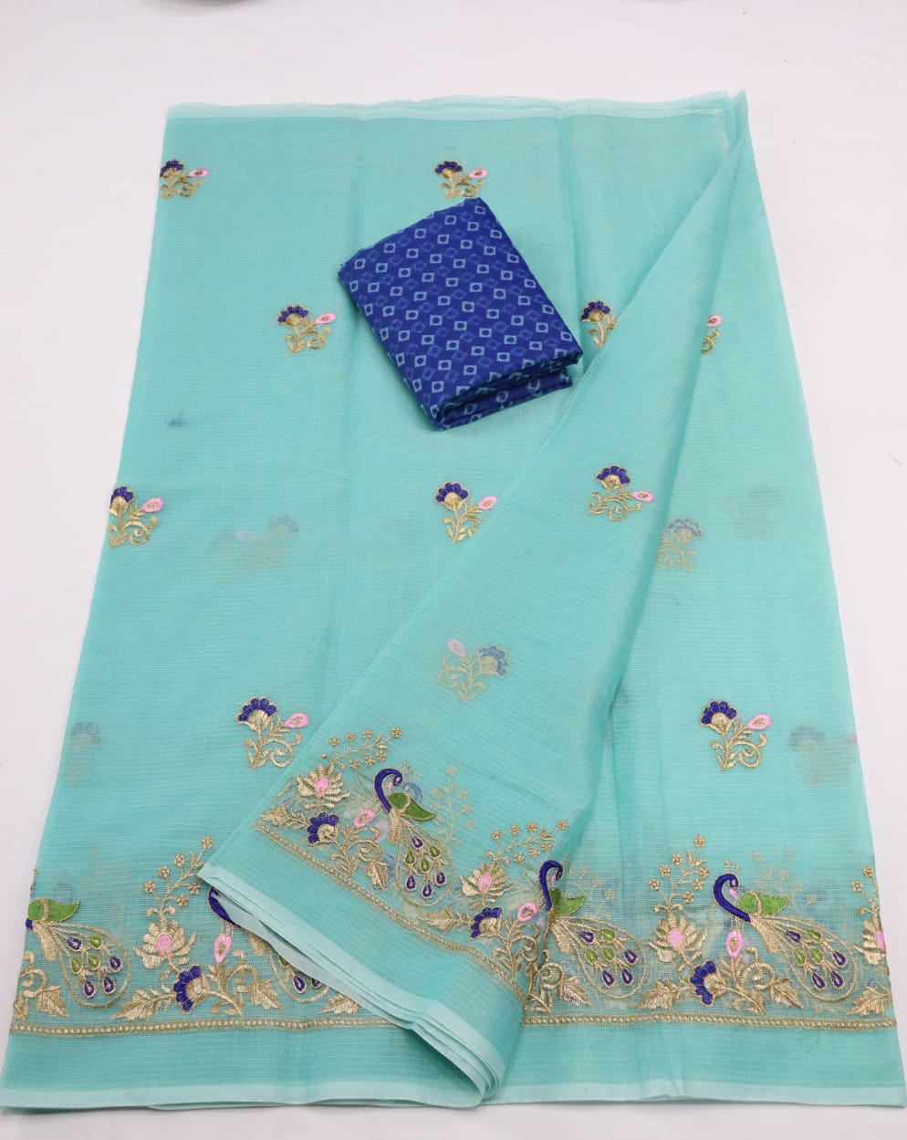 Electric Blue Peafowl Print Kota Doria Zari Work Embroidery Cotton Saree