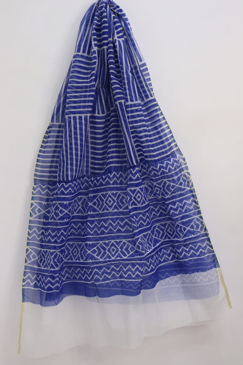 Elegant Blue Striped Block Printed Kota Doria Dupatta
