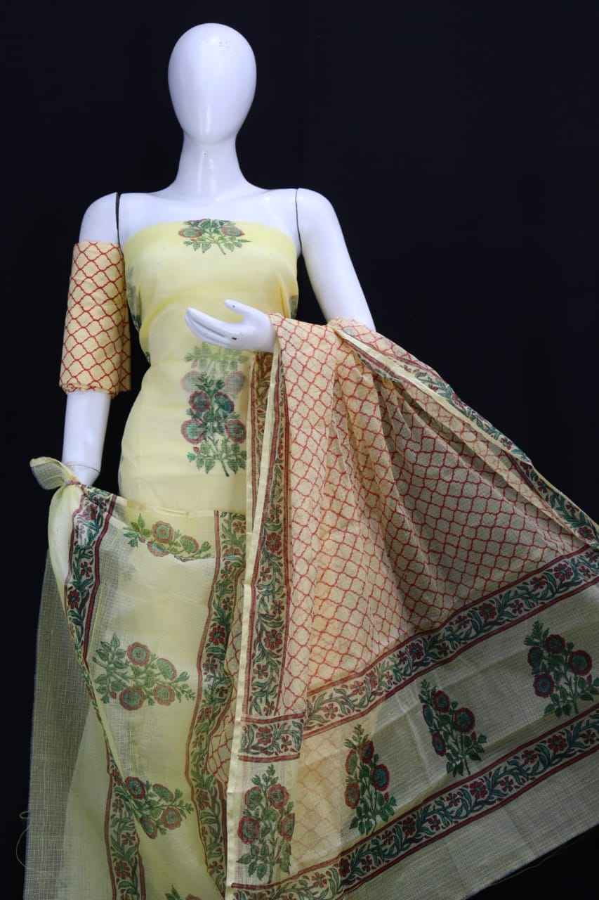 ELegant Designer Handblock Printed Cotton Kota Doria un-stitched Suit With Dupatta