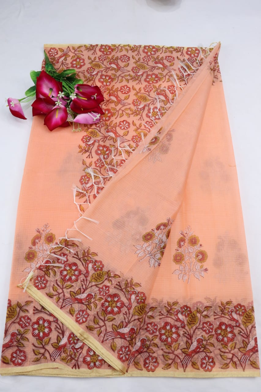 Embellished Peach Flowery KotaDoria Block Printed Cotton Saree With Blouse