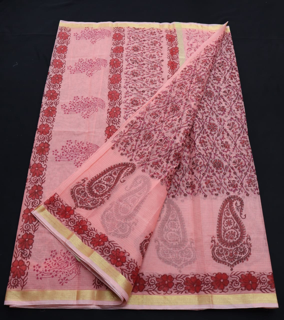 Ethnic Zari Border Pink KotaDoria Block Printed Cotton Saree With Blouse
