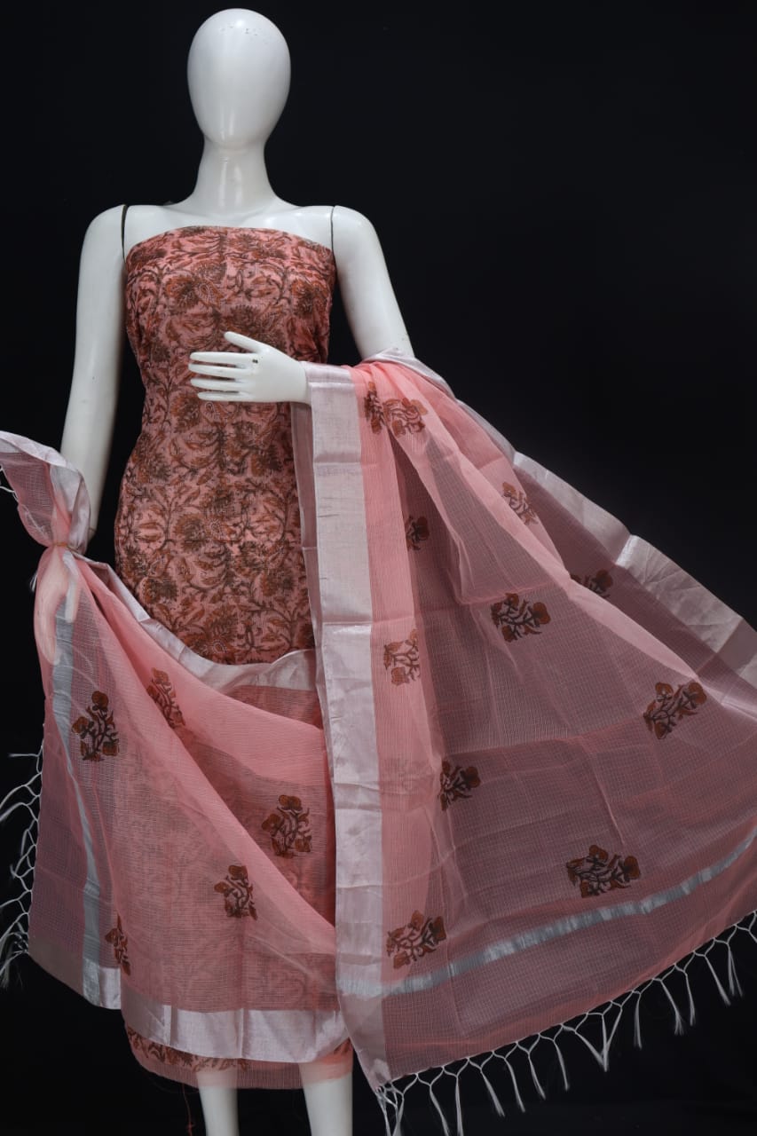Floral Cantaloupe Orange Block Printed Kota Doria Cotton Fabric Dress Material