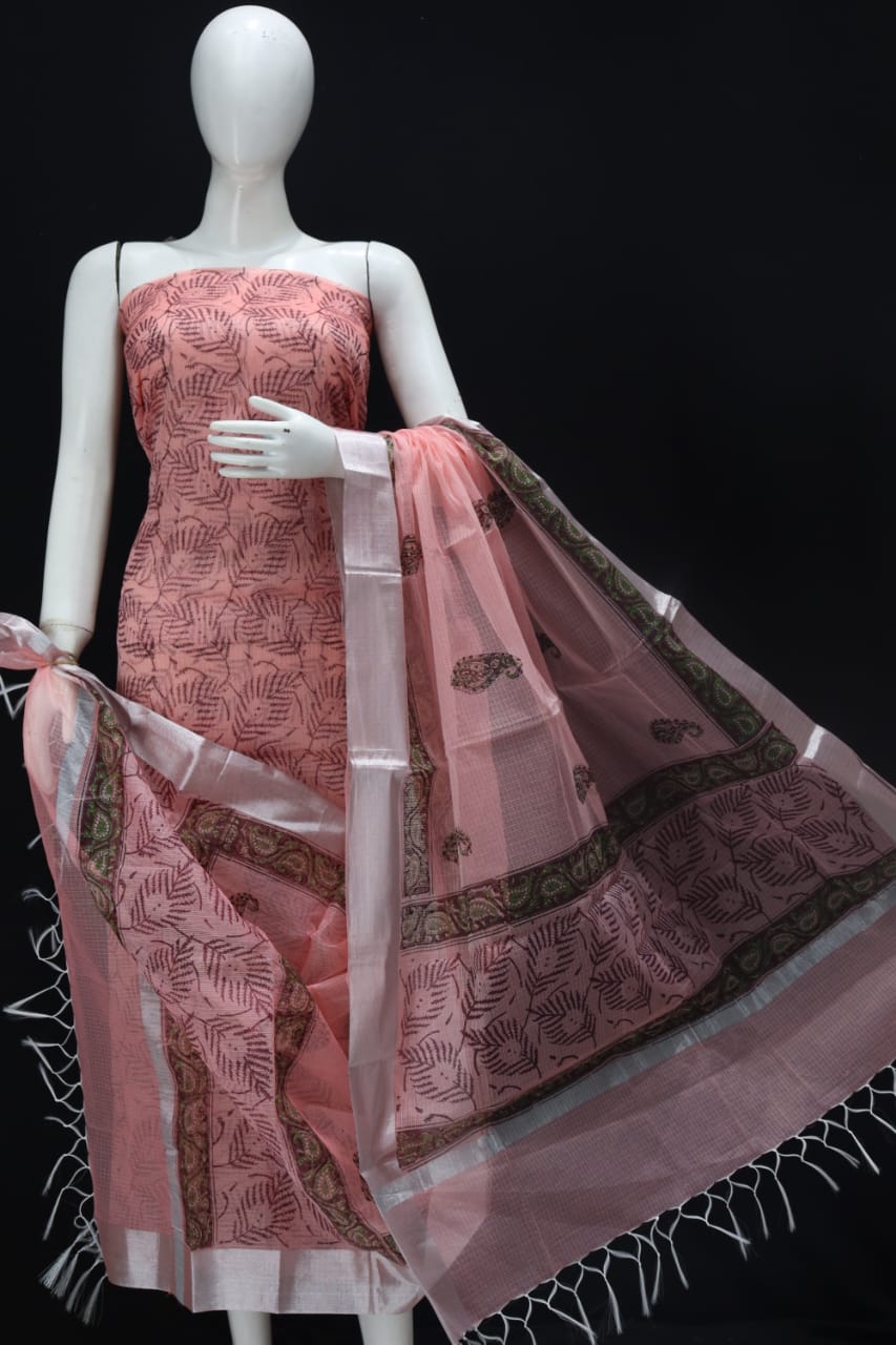 Floral Peach Classic Printed Kota Doria Cotton Fabric Dress Material