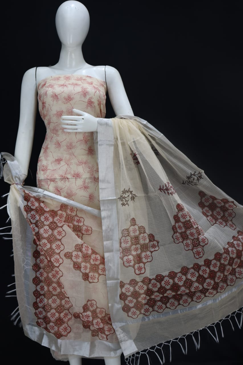 Geometric Cream Floral Classic Printed Kota Doria Cotton Fabric Dress Material