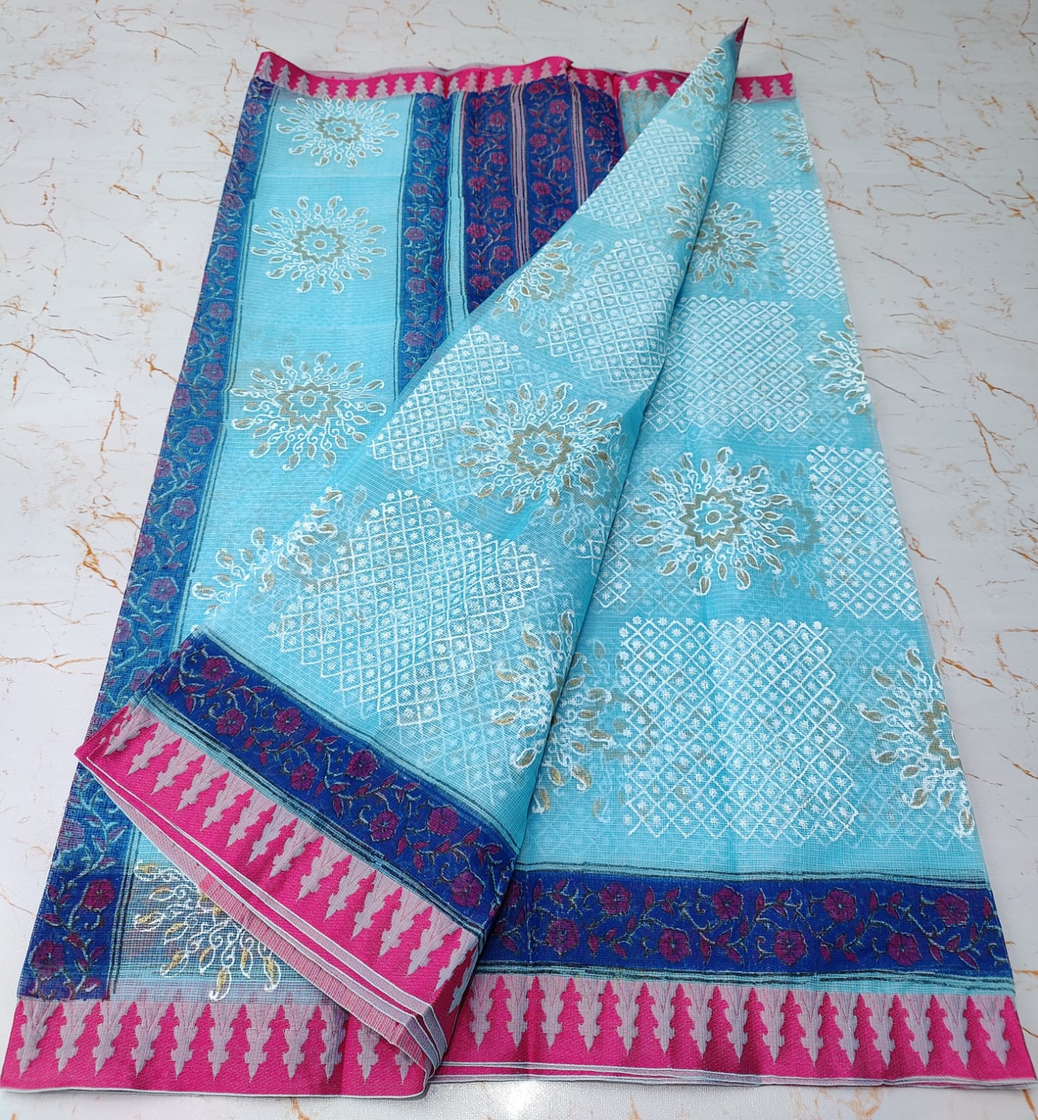 Gracious Blue Flowery KotaDoria Block Printed Cotton Saree With Blouse