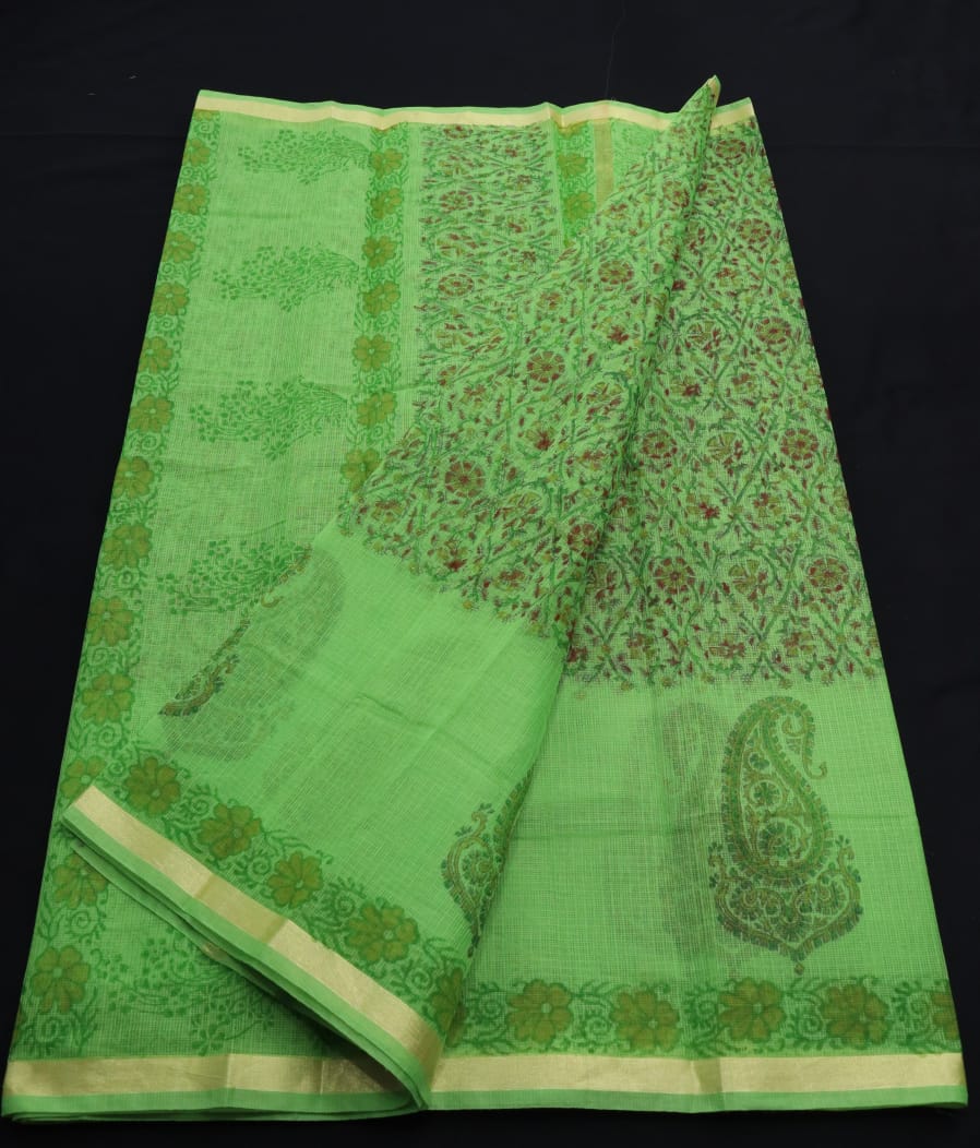 Gracious Zari Border Green KotaDoria Block Printed Cotton Saree With Blouse