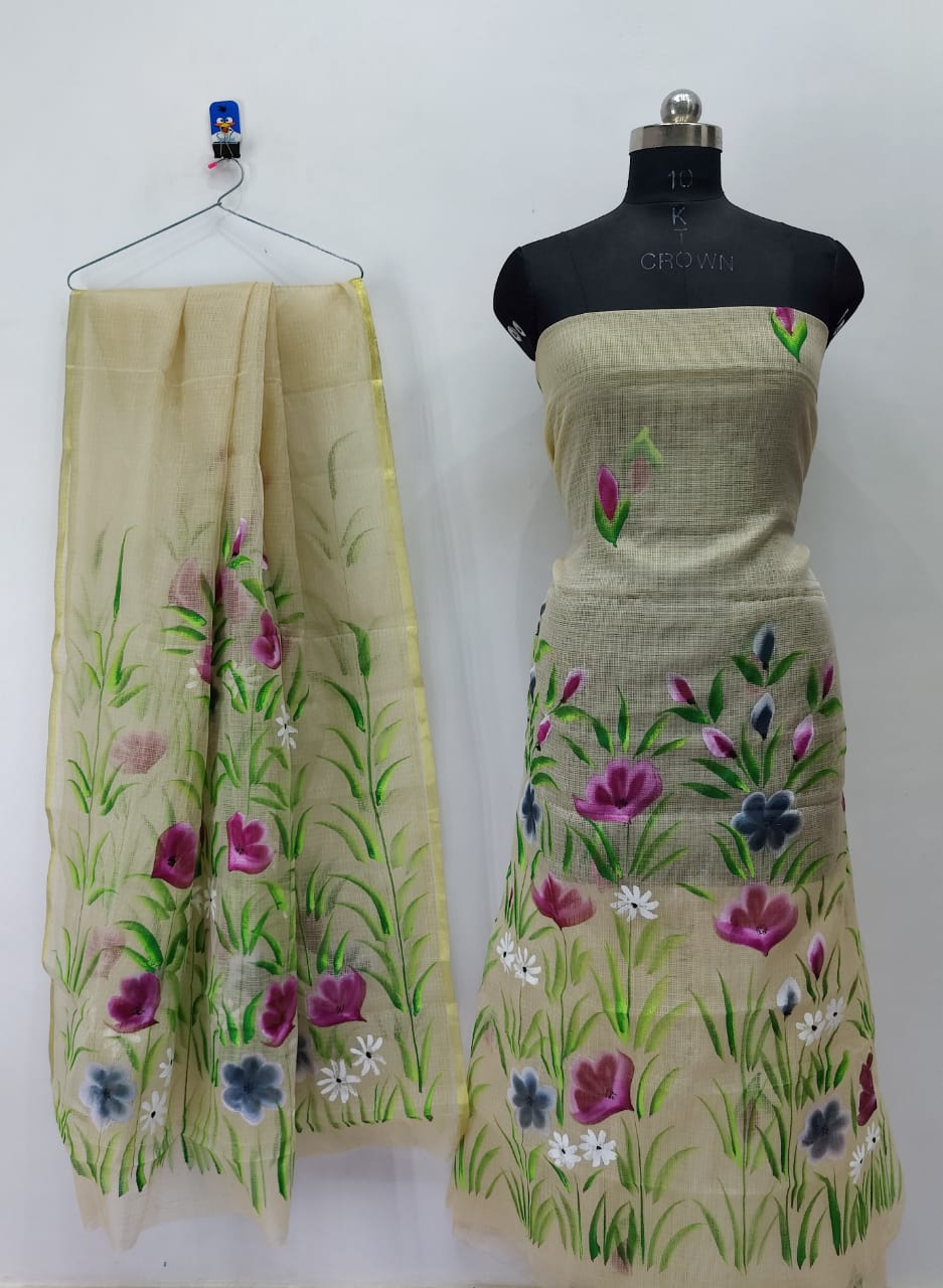 Grassy Floral Cream Brush Paint Kotadoria Un-Stitched Suit With Dupatta