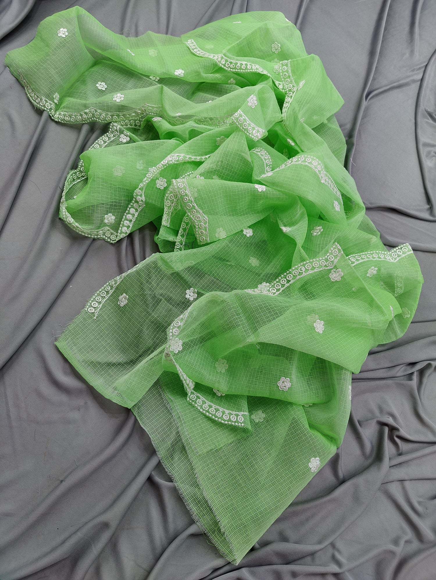 Green Base White Thread Kota Doria Embroidery Dupatta