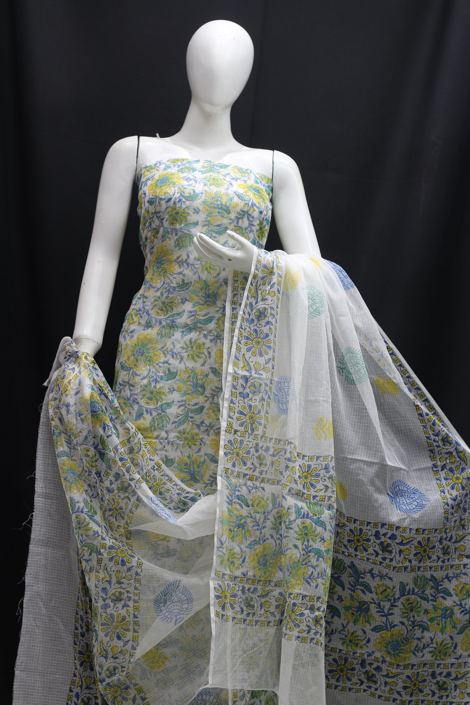 Green Blue Floral Designer Handblock Printed Cotton Kota Doria un-stitched Suit With Dupatta