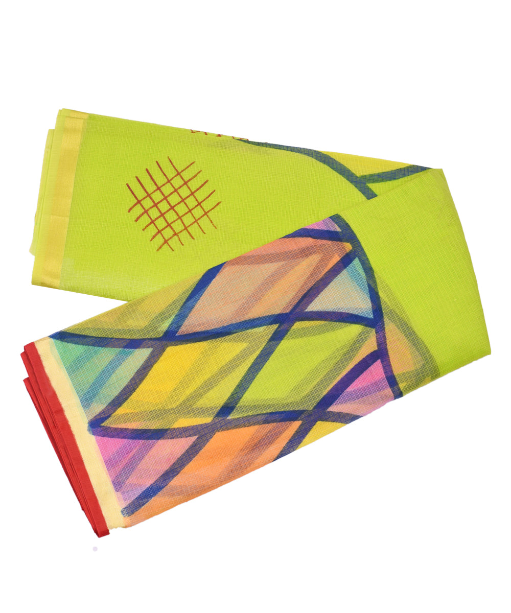 Light Green Geometric Print Zari Border KotaDoria Cotton Saree With Blouse