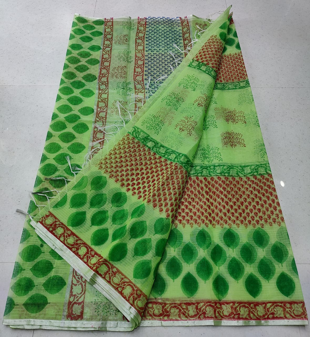 Light Green Leafy Ethnic KotaDoria Block Printed Cotton Saree With Blouse