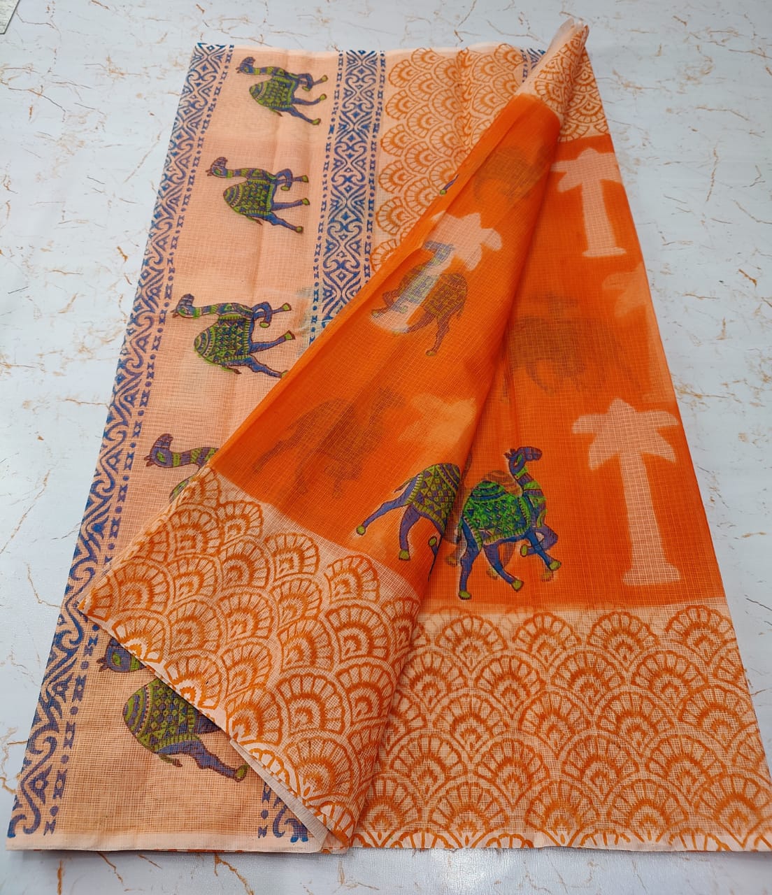 Orange Sofisticated KotaDoria Dye Block Printed Cotton Saree With Blouse