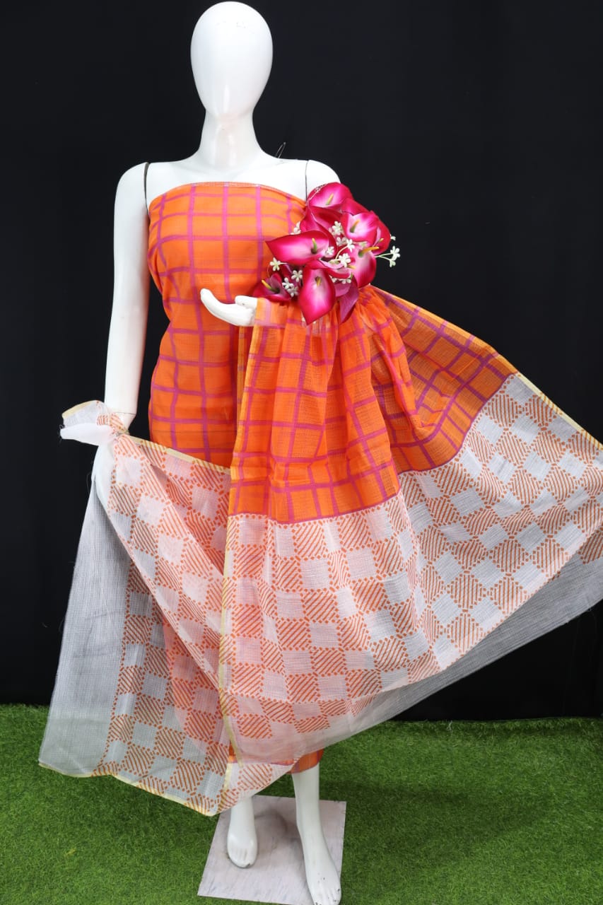 Orange Square Printed Kota Doria Cotton Fabric Dress Material