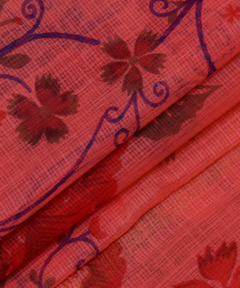 Red Floral Print Zari Border Kotadoria Cotton Saree With Blouse