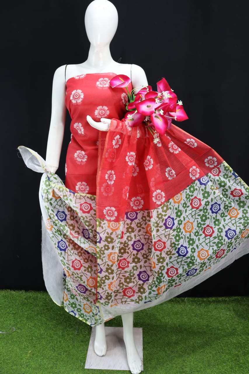 Red Printed Kota Doria Cotton Fabric Dress Material