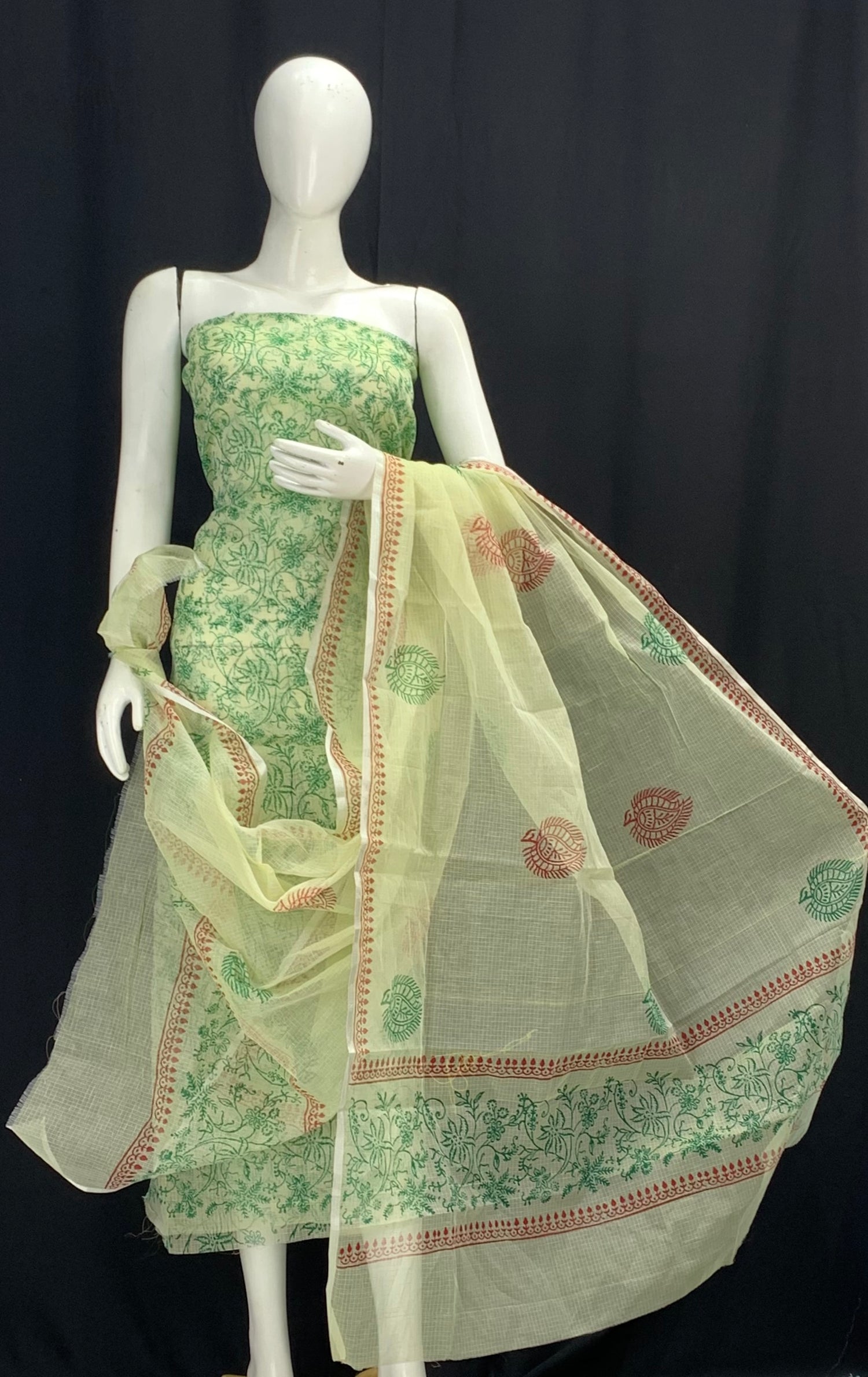 Royal Green Floral Designer Handblock Printed Cotton Kota Doria un-stitched Suit With Dupatta