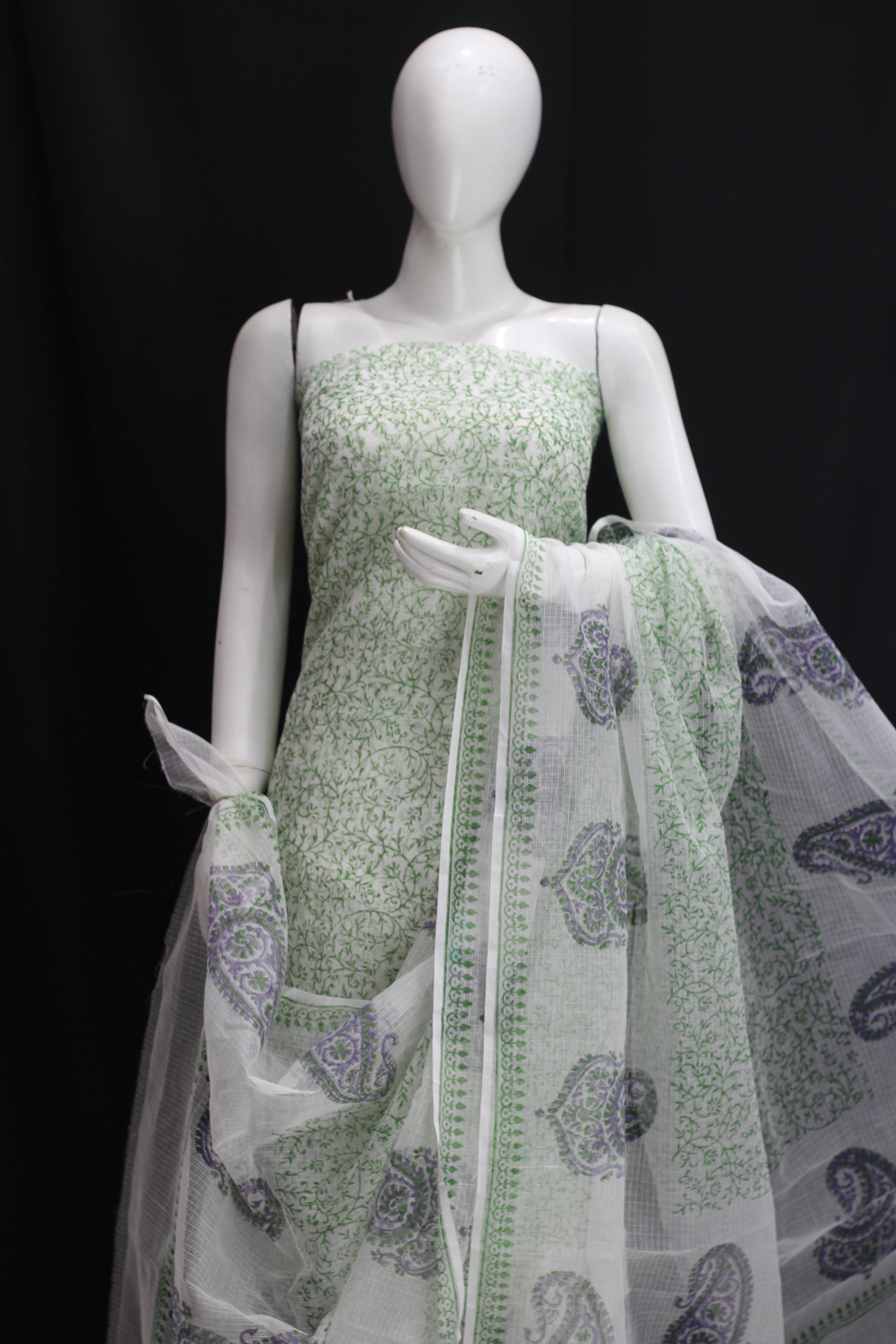 Royal Green Floral Handblock Printed Cotton Kota Doria un-stitched Suit With Dupatta
