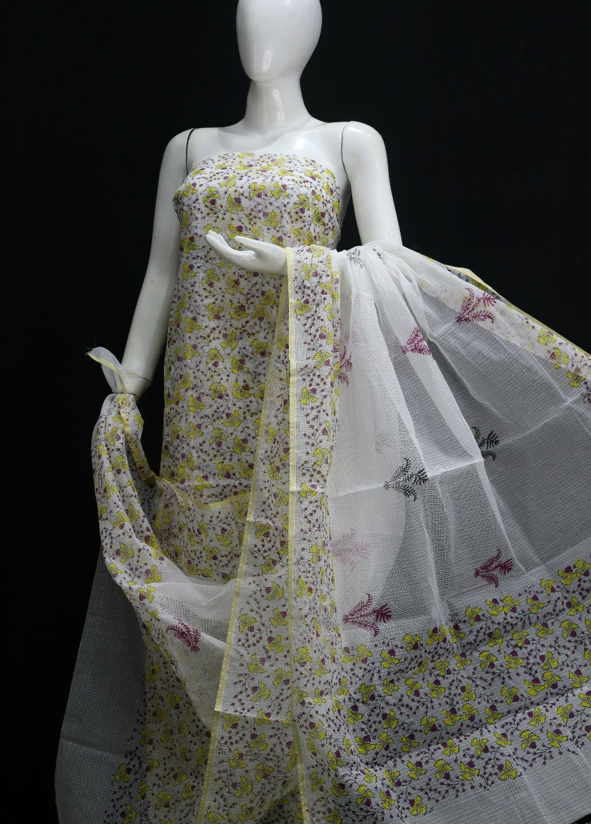 Royal white base Floral Handblock Printed Kota Doria Suit