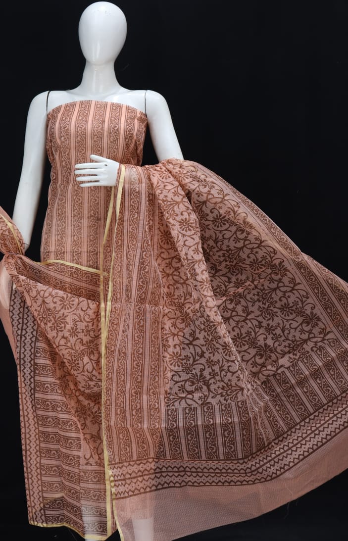 Salmon Peach Striped Designer Handblock Printed Cotton Kota Doria Un-Stitched Suit With Dupatta