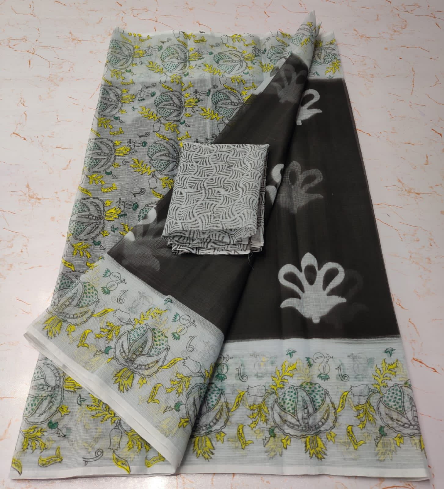 Shadow Grey Chic KotaDoria Dye Block Printed Cotton Saree With Blouse