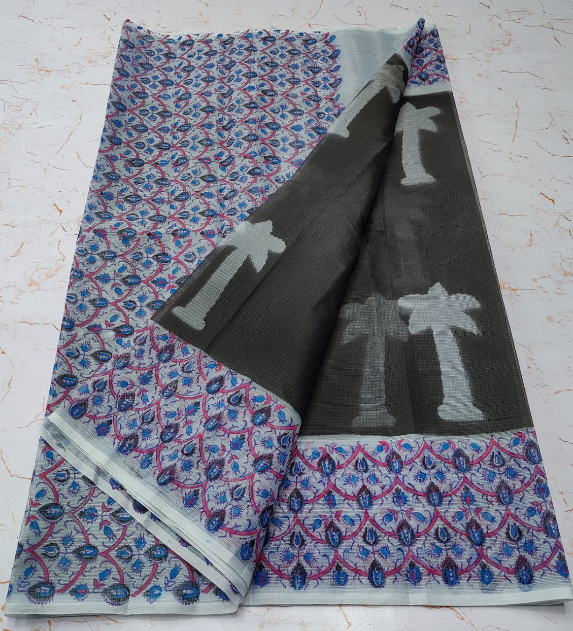 Shadow Grey Sofisticated KotaDoria Dye Block Printed Cotton Saree With Blouse