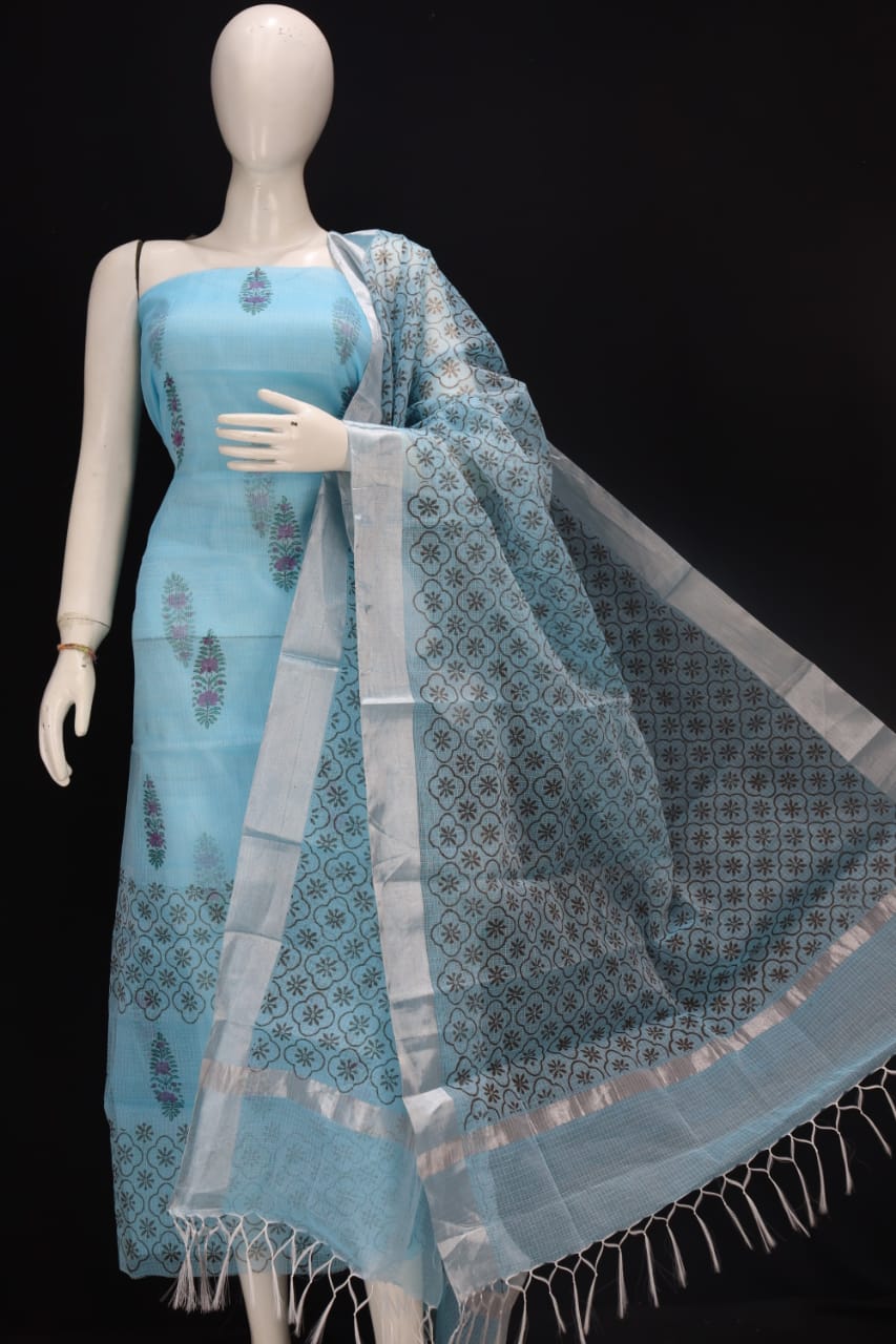 Sky Blue Block Printed Kota Doria Cotton Fabric Dress Material