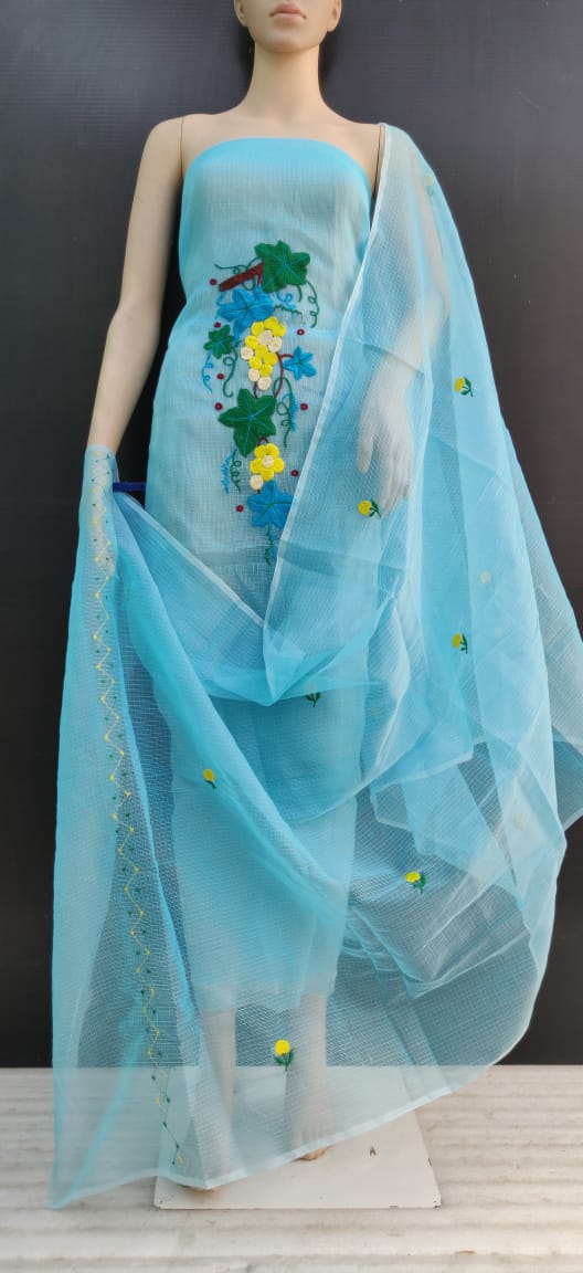 Sky Blue Cotton Kotadoria Embroidery Dress Materials
