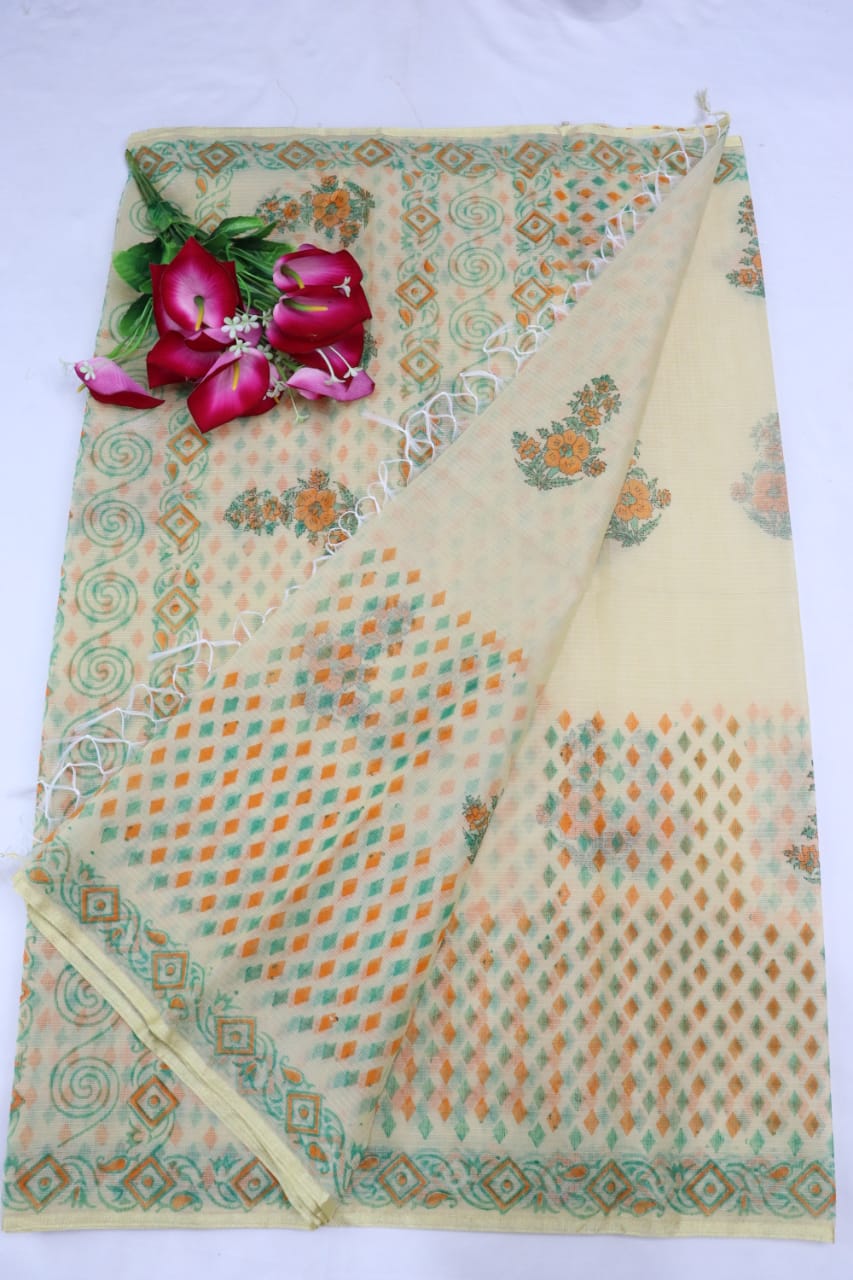 Striped Cream Embellished Flowery Kota Doria Block Printed Cotton Saree With Blouse