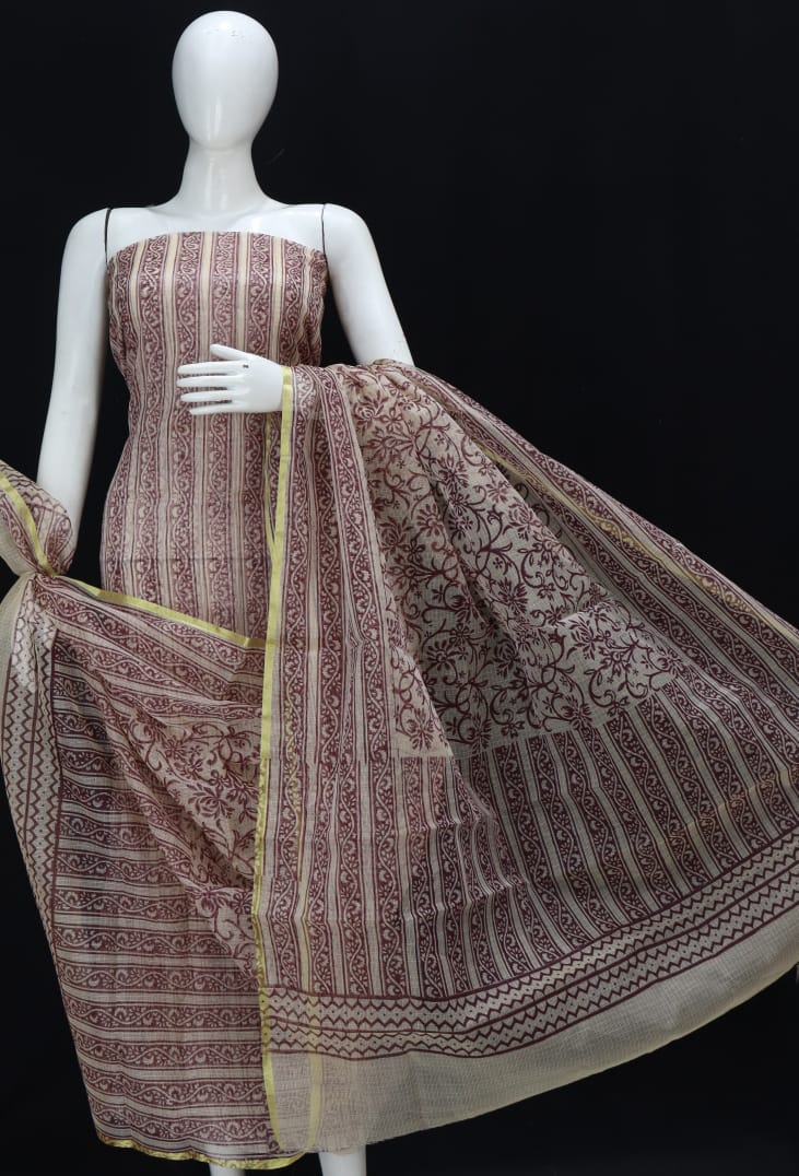 Striped Designer Handblock Printed Cotton Kota Doria Un-Stitched Suit With Dupatta
