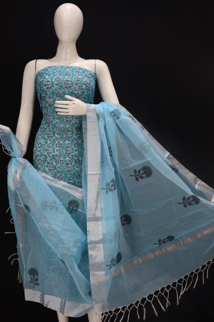 Thin Work Blue Block Printed Kota Doria Cotton Fabric Dress Material