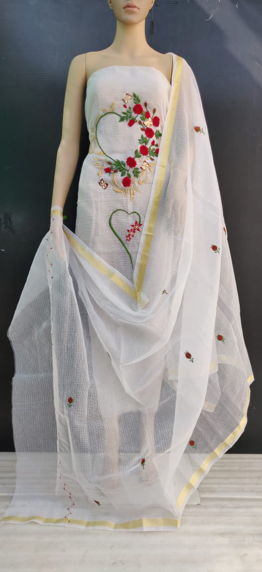 White Fabric Floral Cotton Kotadoria Embroidery Dress Material