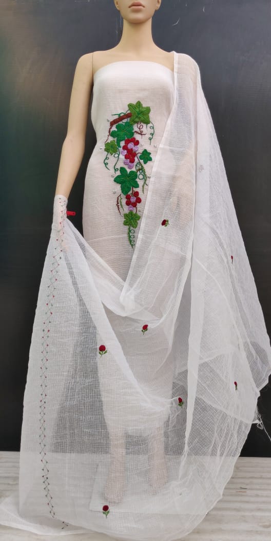 White Fabric Leaves Cotton Kotadoria Embroidery Dress Material