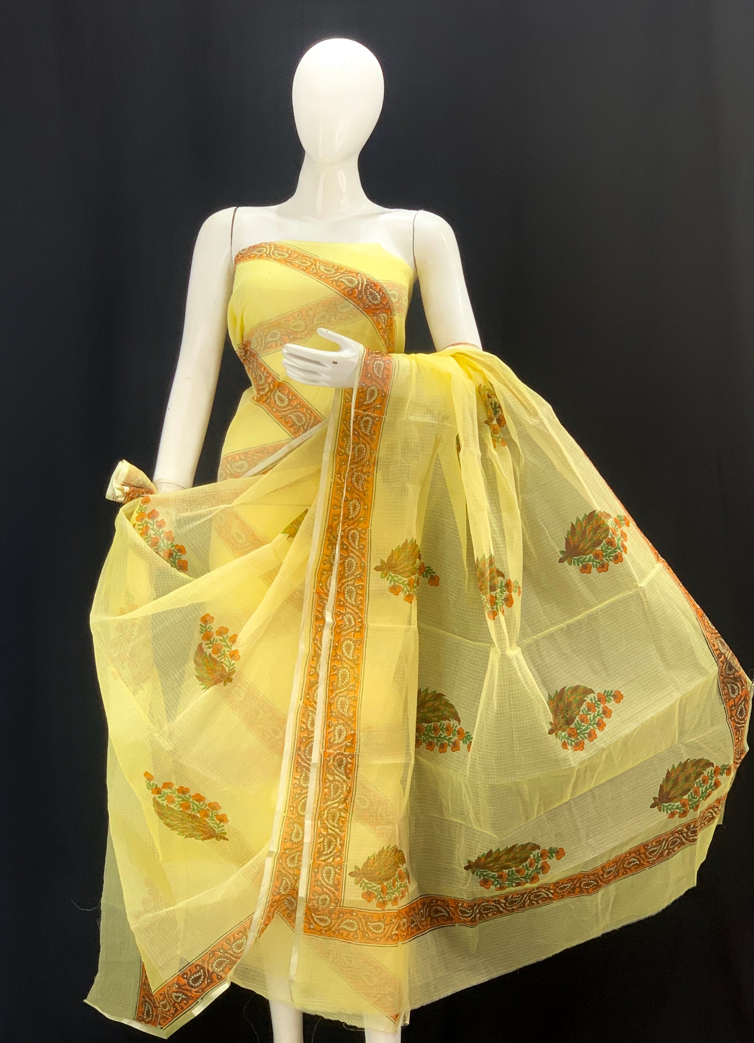 Yellow base with Striped Royal Rajasthani Handblock Printed Cotton Kota Doria un-stitched Suit With Dupatta