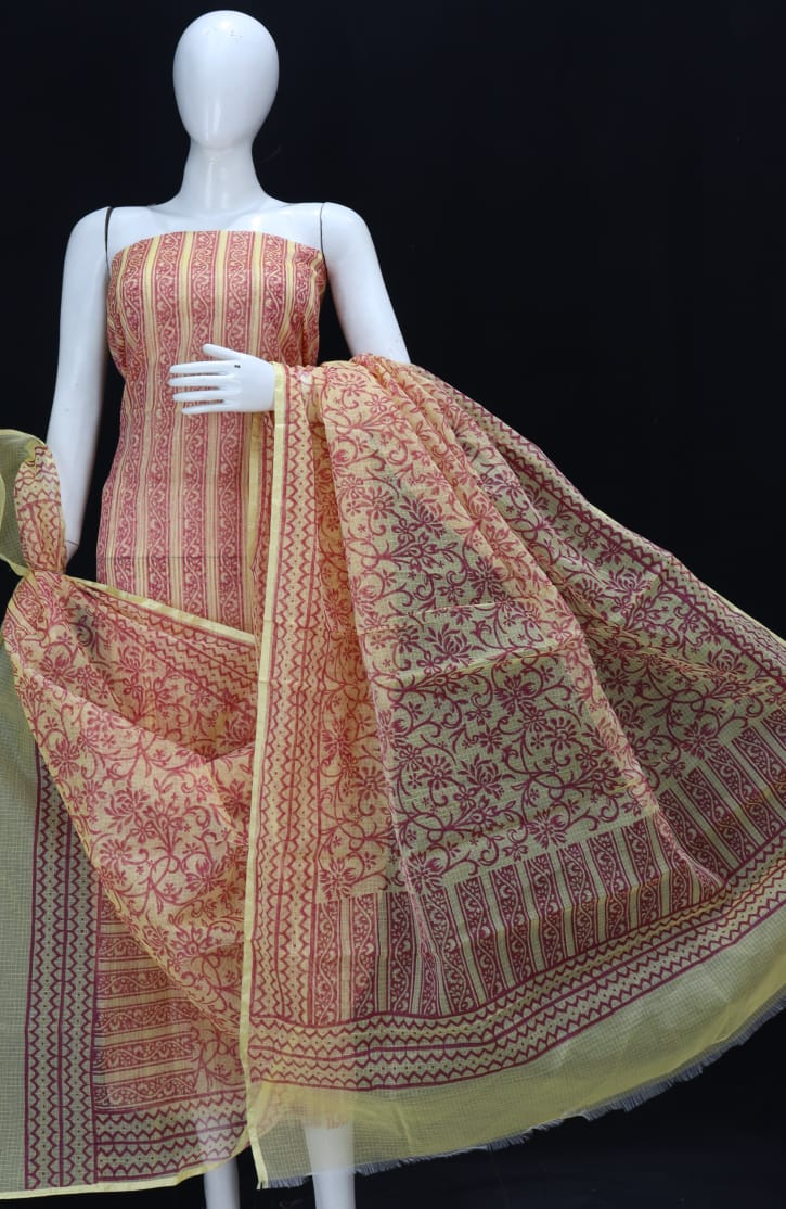 Yellow Peach Striped Designer Handblock Printed Cotton Kota Doria Un-Stitched Suit With Dupatta