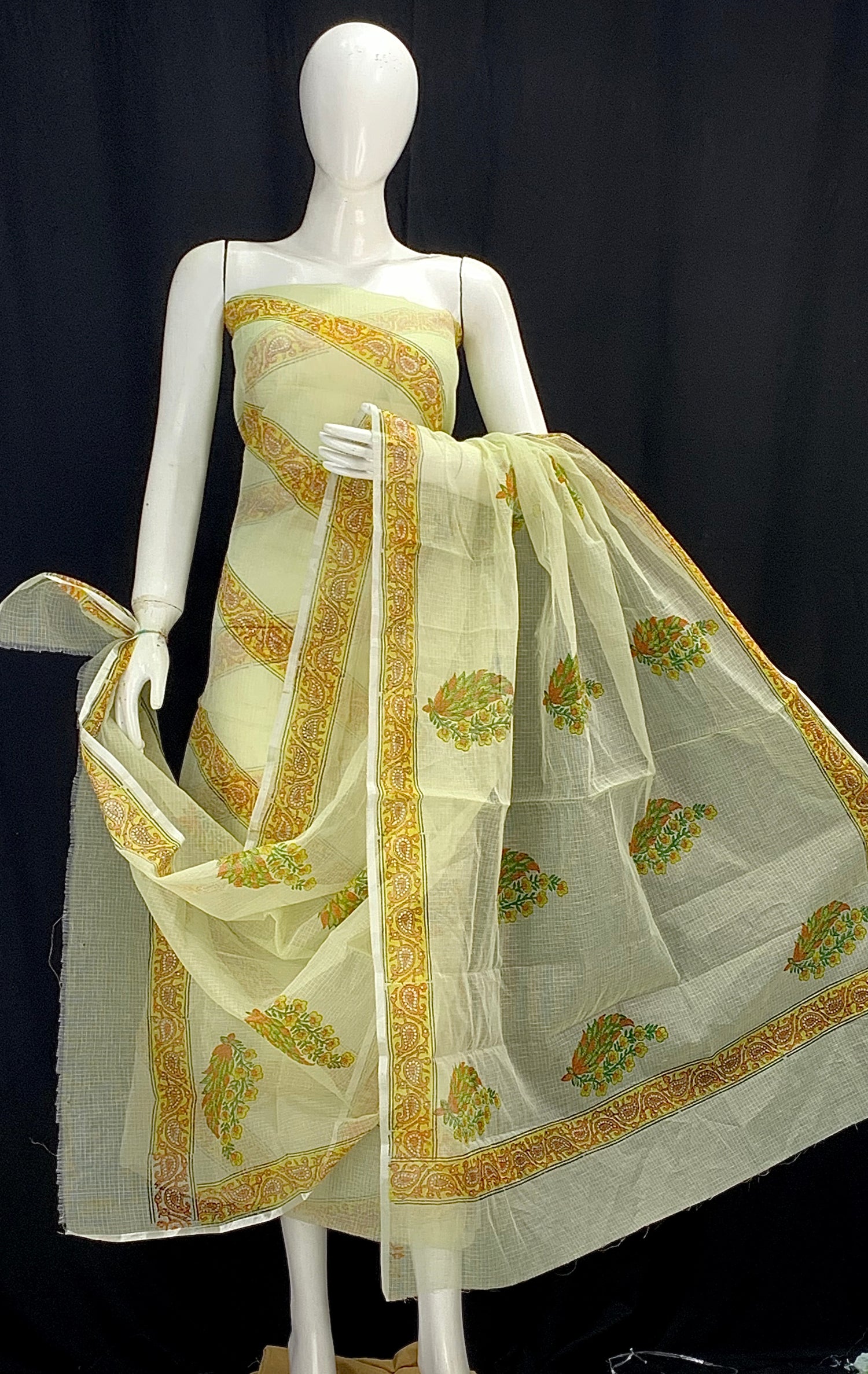 Yellow Striped Designer Handblock Printed Cotton Kota Doria un-stitched Suit With Dupatta